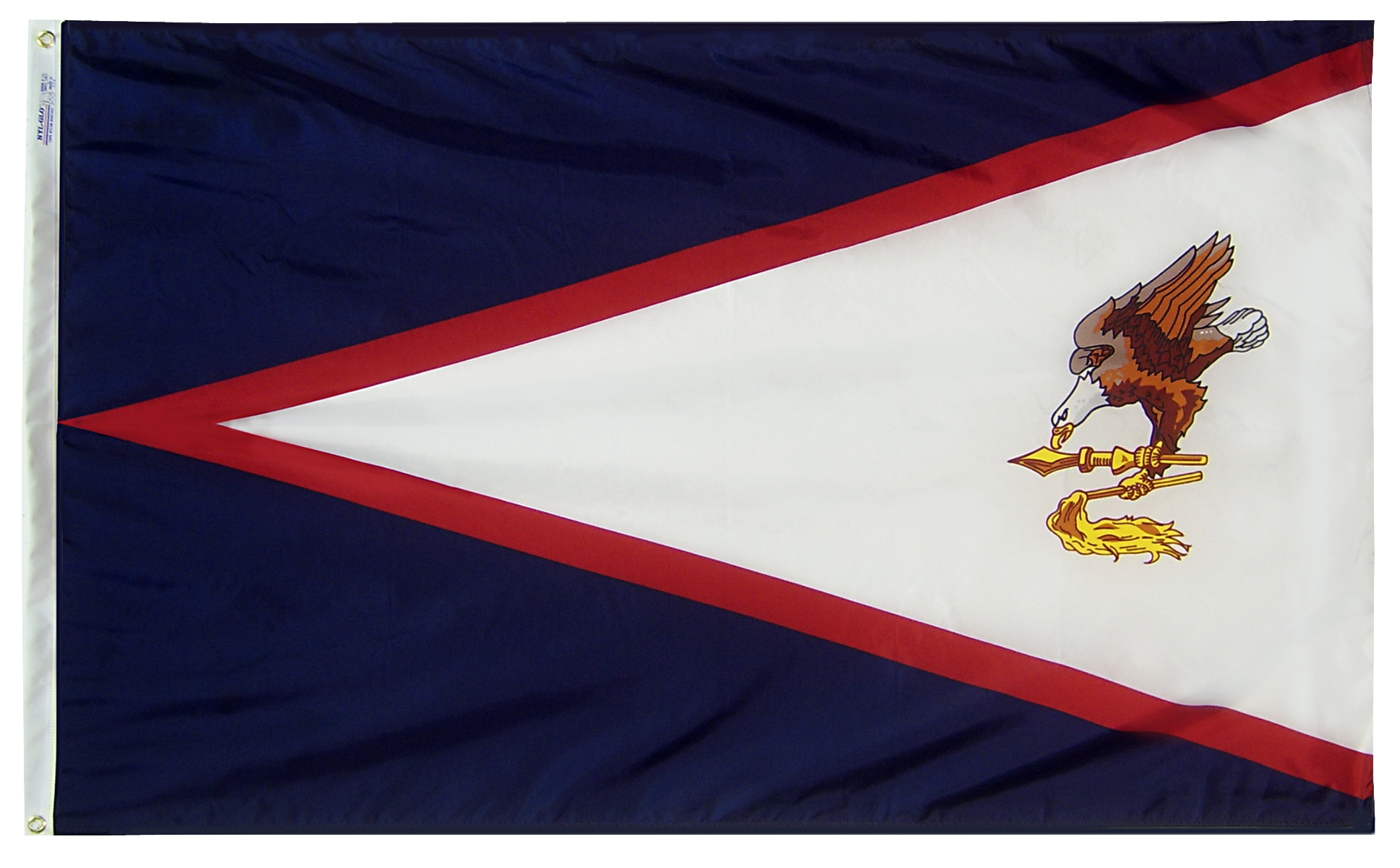 The Flag of the Territory of American Samoa was adopted on April 24, 1960. The eagle present on the Flag represents the nation’s relationship with the United States. The eagle holds traditional symbols of power among Samoan chiefs in its claws. It is the only Flag in the world to contain a single triangle with its base at the right hand side of the Flag, rather than the left. Made from 100% Nylon, America’s No. 1 choice for Flags. Heading is sturdy duck with strong brass grommets. Durable and fast-drying, the dyed design conforms to official state specifications. Available in five sizes.
