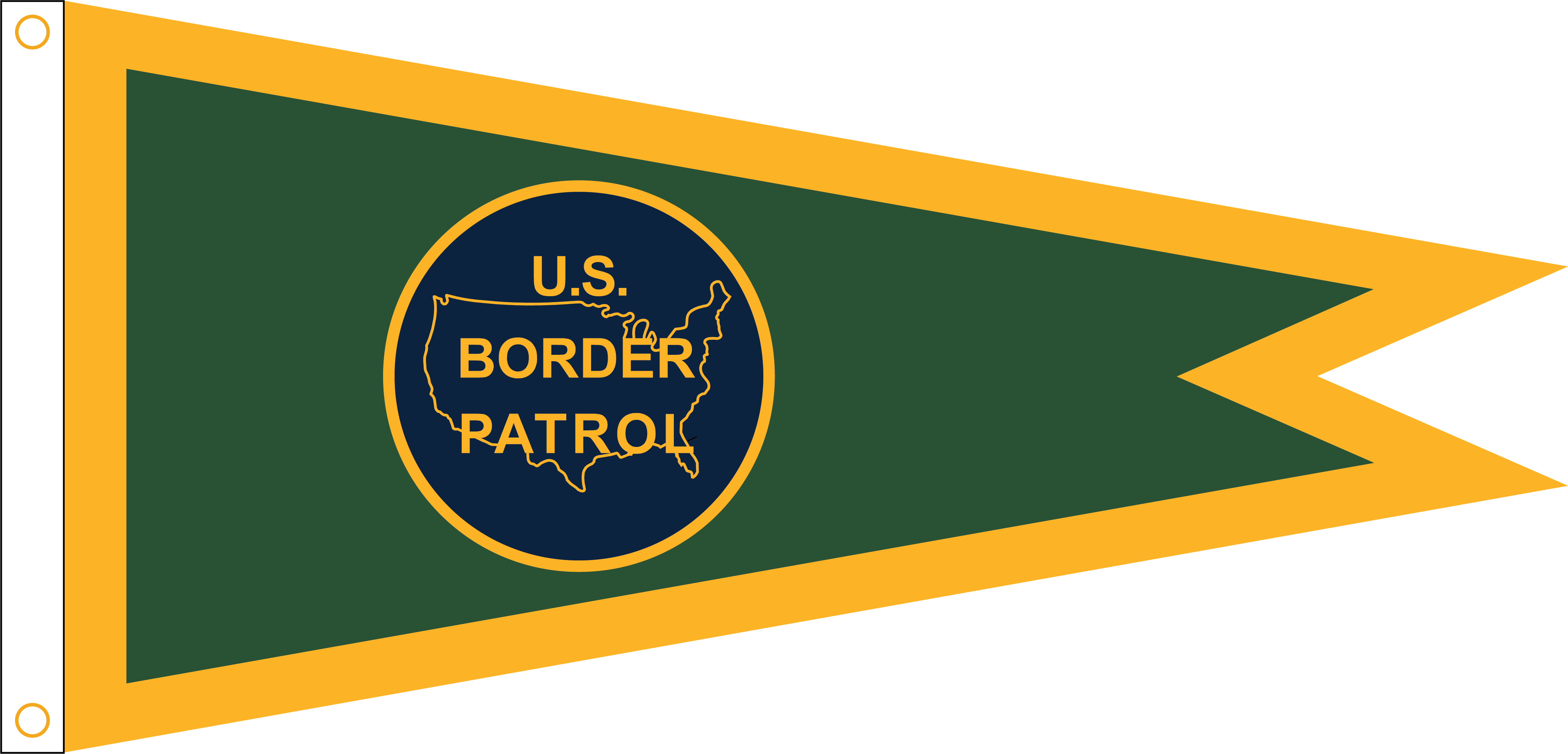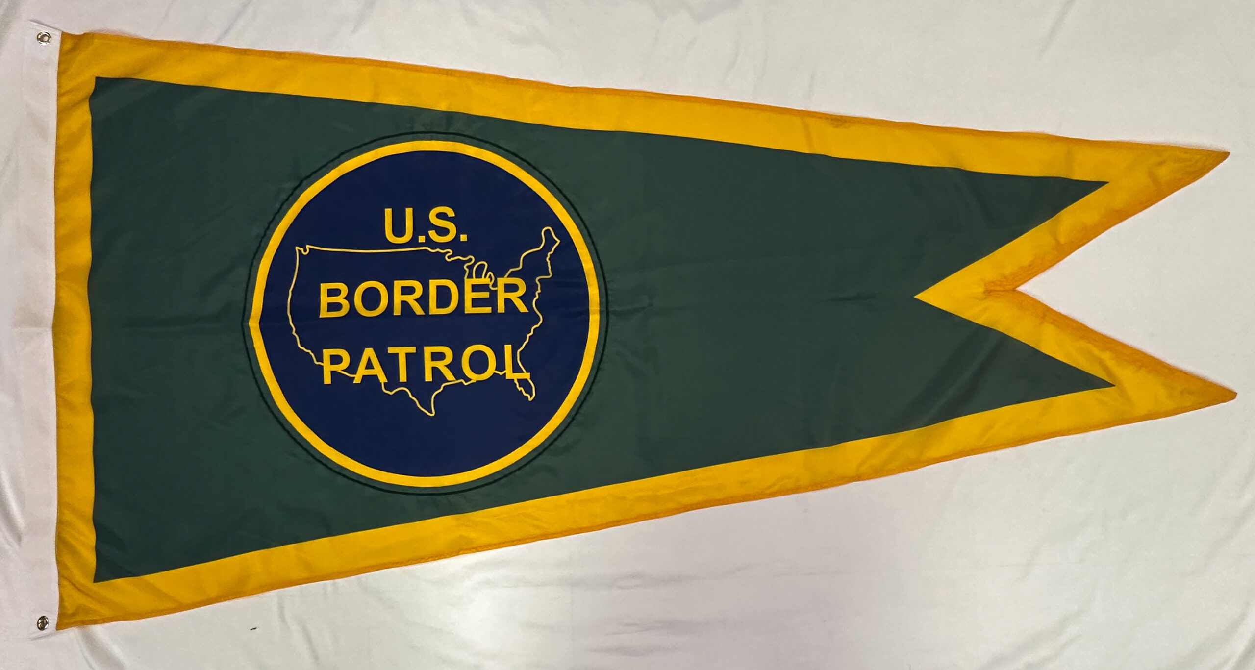 36 x 72 in. U.S. Border Patrol swallow tail pennant with the department seal centered on a hunter green background with a yellow border
