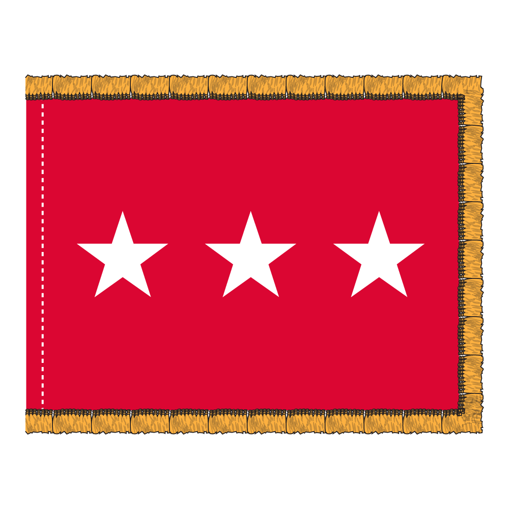 This 3×4 ft Army General Flag features three appliquéd stars, denoting the rank of a 3 Star General in the Army. Crafted from durable 200 denier nylon, this flag is intended for indoor use. It includes a pole hem with fringe (PHF), offering an elegant and ceremonial appearance. The fringe adds a sophisticated touch, making it ideal for formal settings.
