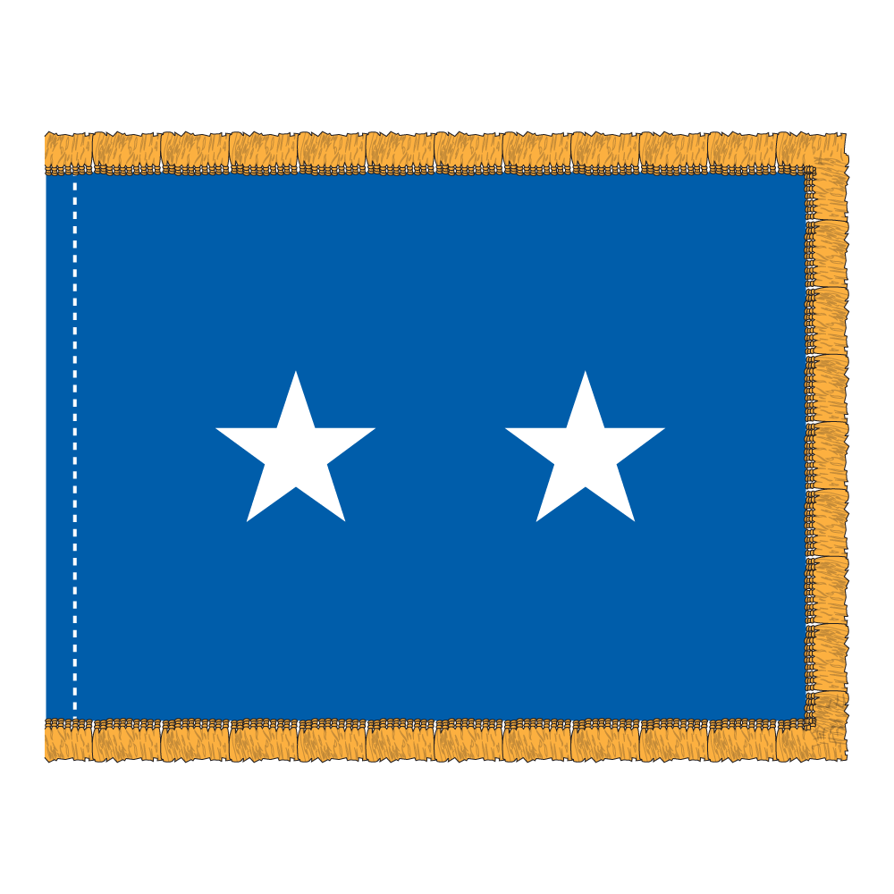 This 3×4 ft USAF General Officers Flag features two appliquéd stars on a high-quality 200 denier nylon field, representing the rank of a 2 Star General in the Air Force. Designed for indoor display, it includes a pole hem with fringe for an elegant, ceremonial look. The detailed appliqué ensures that the stars are prominently displayed and durable.