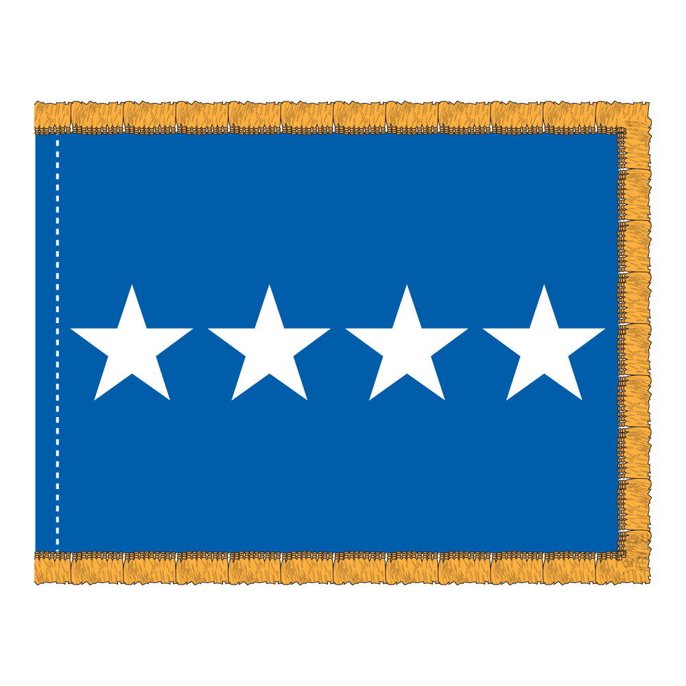 This 3×4 ft USAF General Officers Flag features four appliquéd stars on a high-quality 200 denier nylon field, representing the rank of a 4 Star General in the Air Force. Crafted for indoor use, it includes a pole hem with fringe for an elegant, ceremonial appearance. The detailed appliqué ensures the stars are prominently displayed and durable.
