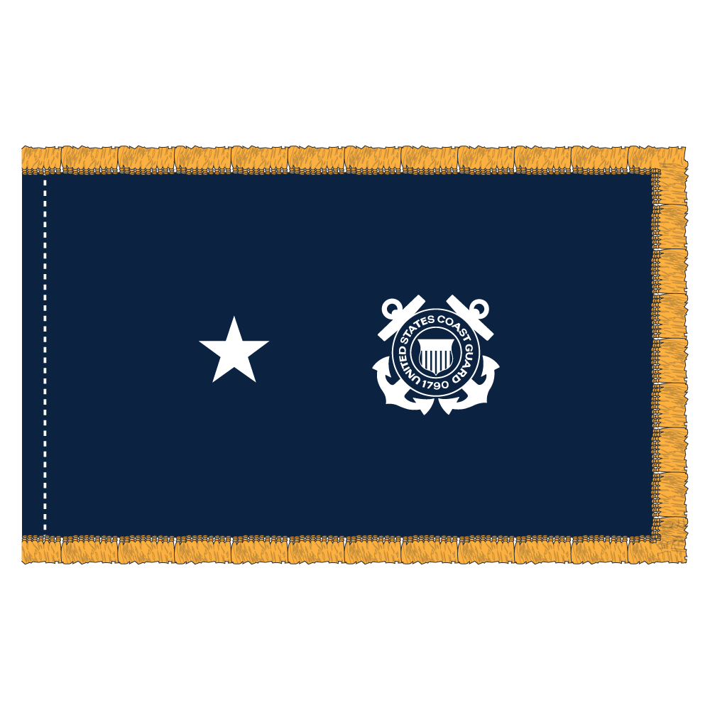 This 3×5 ft Coast Guard 1 Star Admiral flag features a durable design crafted from 200 denier nylon. The star is intricately appliquéd, adding a premium touch. Available with a pole hem and fringe for an elegant finish. Perfect for display or ceremonial use.
