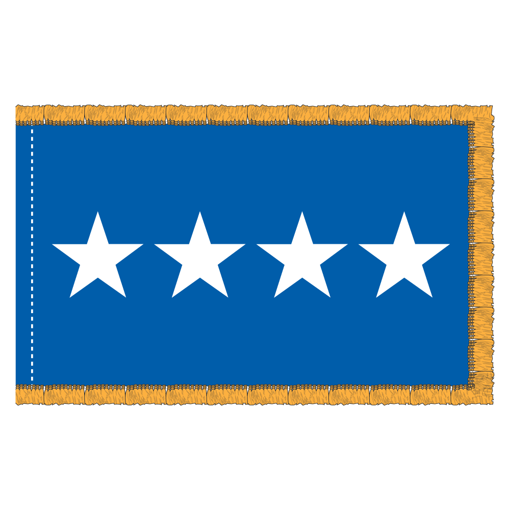 This 3×5 ft USAF 4 STAR GENERAL flag features a striking design with appliquéd stars, crafted from durable 200 denier nylon. It comes finished with a pole hem and fringe, making it perfect for display.