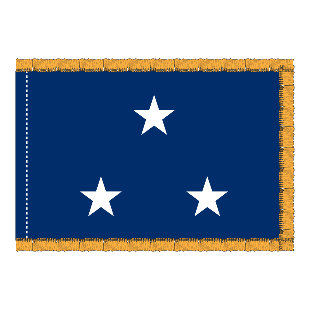 This Navy Admiral officer flag features a vibrant blue field with three appliquéd white stars, crafted from durable 200 denier nylon. Complete with fringe and a pole hem, this flag is designed for elegance and resilience. Size available: 4×6 ft.