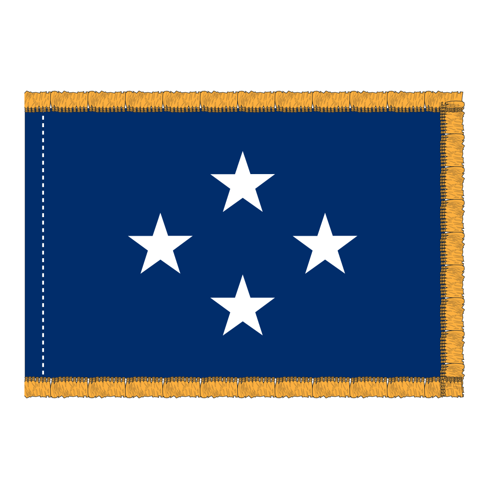 This Navy Admiral officer flag measures 4×6 ft and is made from durable 200 denier nylon. The striking blue field features four appliquéd white stars, complemented by a decorative pole hem with fringe for an elegant finish. Perfect for displaying your pride and respect for the Navy.