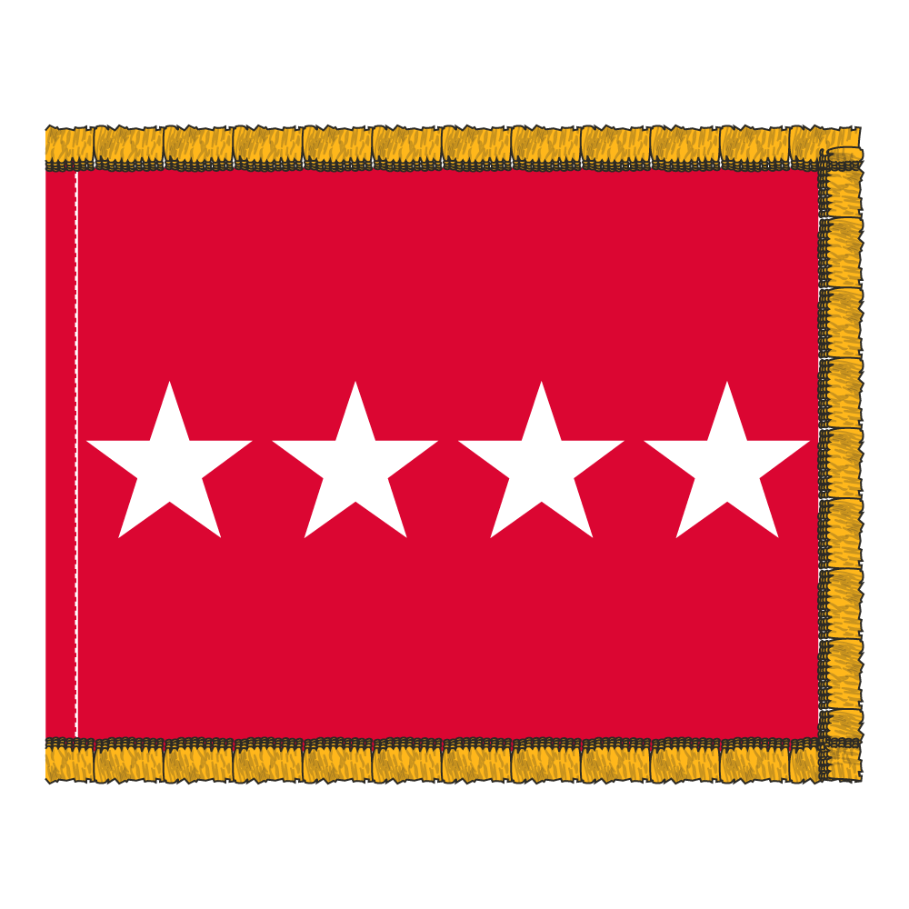 Elevate your space with our 52×66 in 4 Star Army General flag, crafted from durable 200 denier nylon for long-lasting vibrancy. This flag features beautifully appliqued stars and comes with a stylish pole hem finish with fringe, making it perfect for display. Ideal for both indoor and ceremonial use, this flag embodies honor and respect.