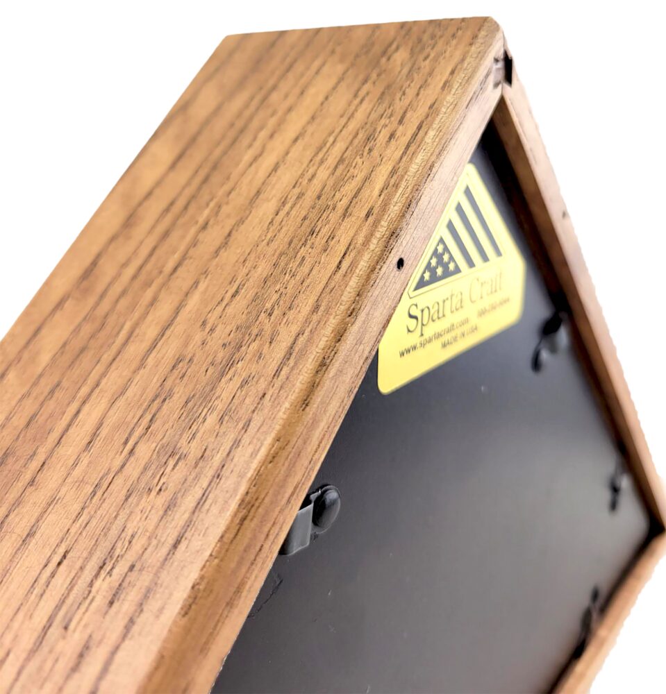 It is constructed from solid American hardwoods and is designed to showcase both military and non-military flags.
