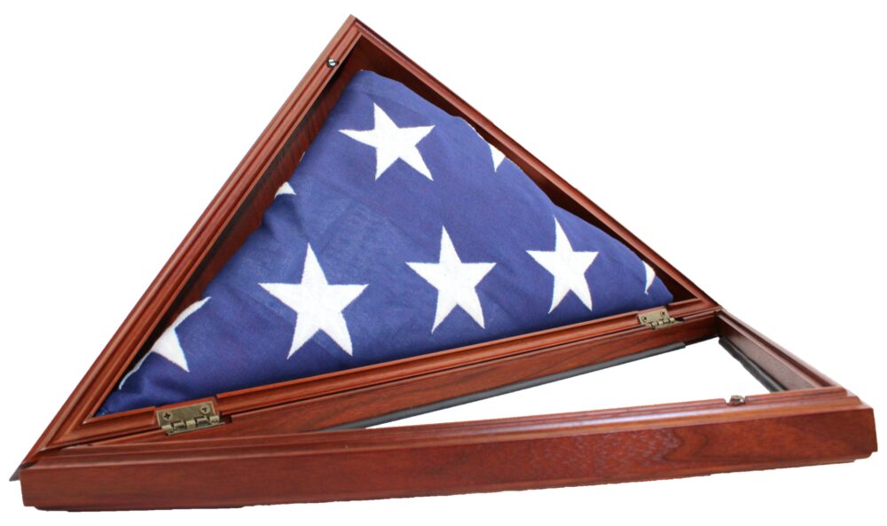 The case opens from the front with a hinged lid; has a hidden magnetic closure and integrated dust seal to best preserve your flag. Hold the standard 5’ x 9.5’ Burial Flag.