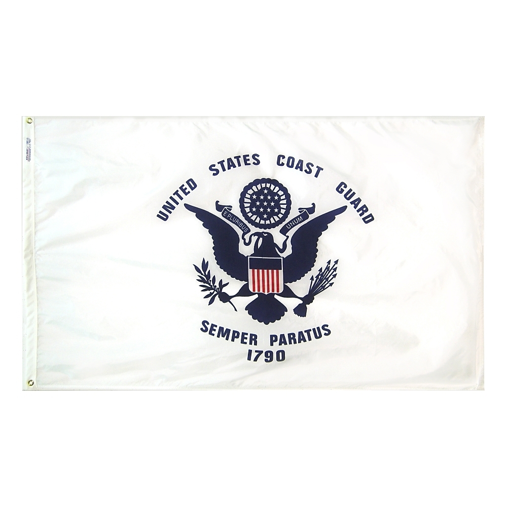 The Revenue Cutter Service, predecessor of the United States Coast Guard, had a flag designed for it in 1799. That flag, with vertical stripes, is still in use but it was not chosen by the Coast Guard when a ceremonial color was adopted in July 1951. The United States coat of arms, dating from 1782, was displayed in the center of a white field and instead of the usual colors the design featured the national red, white, and blue. The name of the service is inscribed above the coat of arms, while below is the Coast Guard motto, SEMPER PARATUS (Always Ready). The date 1790 honors the creation of the Revenue Cutter Service. This flag is 100% Made in USA to Official Specifications. Expertly printed and sewn using 200 denier nylon fabric. Proven to last the longest and be the brightest. Durable fabric flies in the lightest breeze and blocks damaging UV rays. Finished with sturdy canvas heading and strong brass grommets.