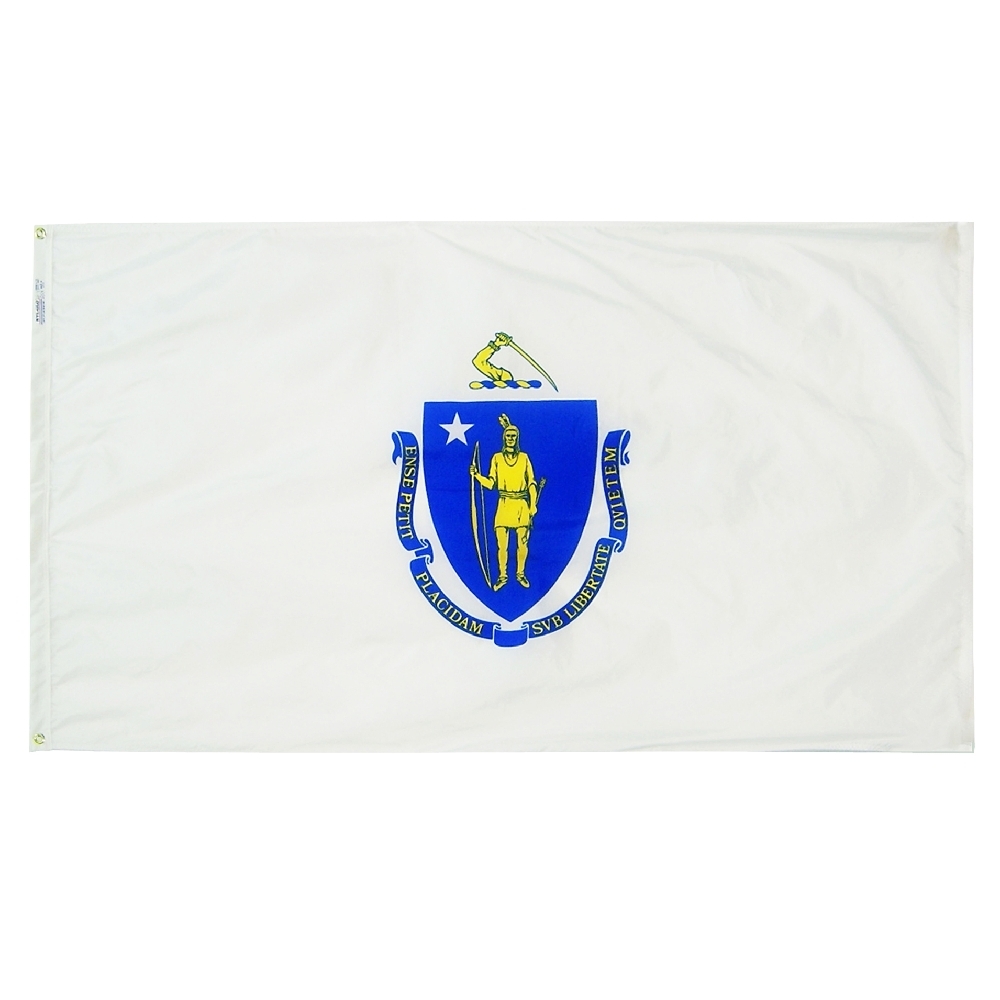 The Massachusetts Flag has a blue, gold and white design on a white field. The state seal appears in the middle, and has an Indian in gold on a blue shield with a white star representing the United States above it. Above the shield is a crest with an arm holding sword, below it is a scroll containing the state motto, Ense petit placidam sub liberate quietem, by the sword we seek peace, but peace only under liberty. 100% Made in USA to Official State Design Specifications. Expertly printed and sewn using 200 denier nylon fabric. Proven to last the longest and be the brightest. Durable fabric flies in the lightest breeze and blocks damaging UV rays. Finished with sturdy canvas heading and strong brass grommets.