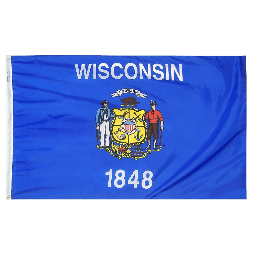 The Wisconsin state Flag consists of the state seal on a blue field. The state name and date of admission to the Union, 1848, appear above and below the seal. A sailor and a miner support a shield divided into quarters. Navigation, manufacturing, mining and agriculture are represented in each quarter by tools of their trade. A cornucopia and a pyramid lie below the shield, with the state motto, Forward, in a scroll above. 100% Made in USA to Official State Design Specifications. Expertly printed and sewn using 200 denier nylon fabric. Proven to last the longest and be the brightest. Durable fabric flies in the lightest breeze and blocks damaging UV rays. Finished with sturdy canvas heading and strong brass grommets.