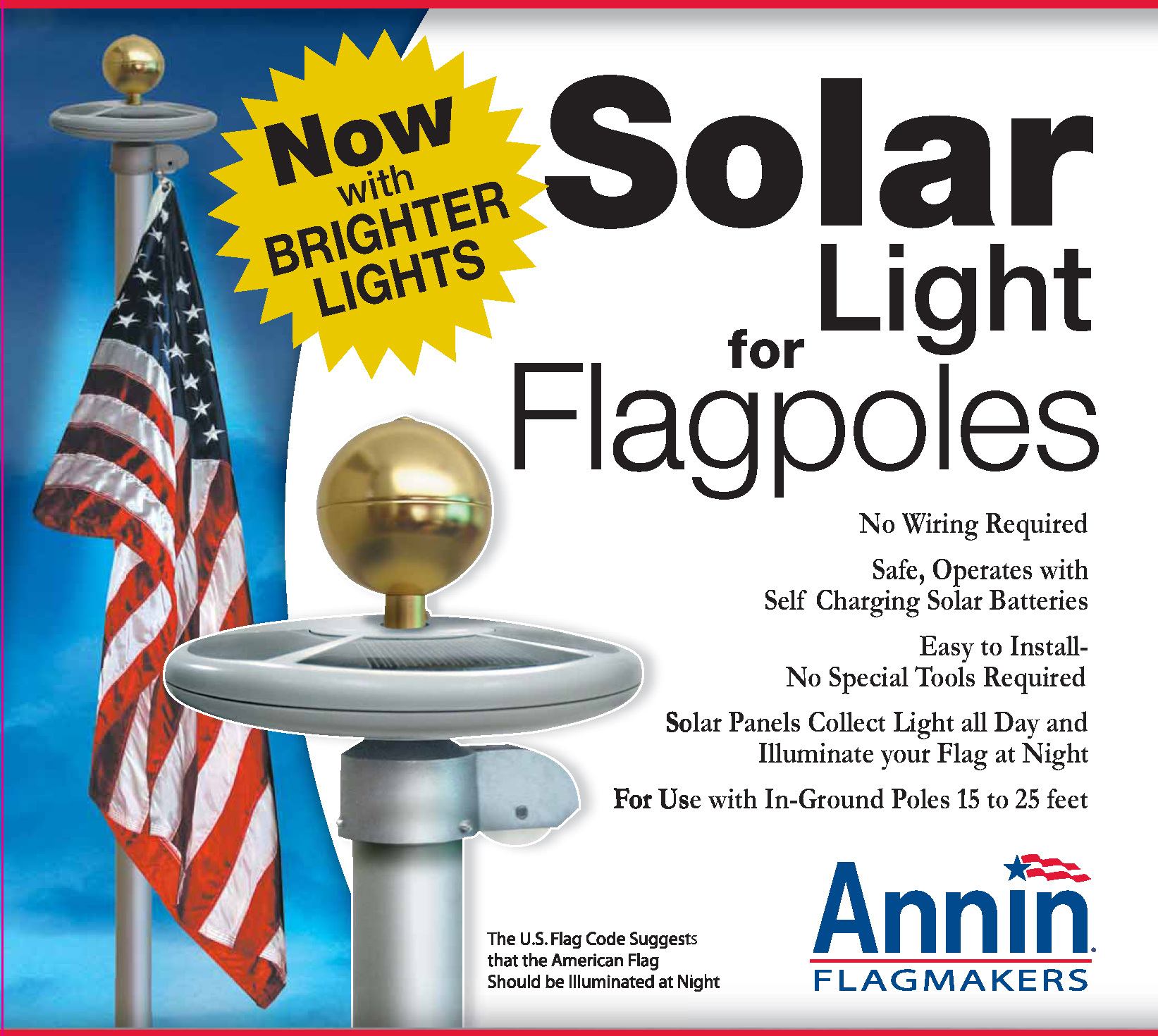 Designed for use with select in-ground poles 15 to 25 feet in height. Note: Requires adapter for use with Villager III and other fiberglass flagpoles. Please call us for assistance. No special tools or wiring required. Solar panels collect energy from the sun all day and illuminate your flag at night. 7 7/8 in. X 2 in.